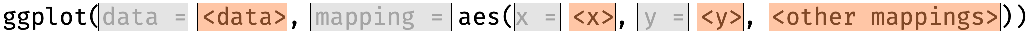 data =, mapping =, x =, and y = each time.ggplotgeom - the geometric object to use display the datastat - statistical transformation to use on the datadata - data to be displayed in this layer (usually inherited)mapping - aesthetic mappings (usually inherited)position - position adjustmentgeom_ or (less commonly) stat_.layer() function.geom_histogram()ggplot2 uses 30 bins (bins = 30) when drawing histograms.geom layers in ggplot2Scroll to see all the available geom layers in ggplot2.