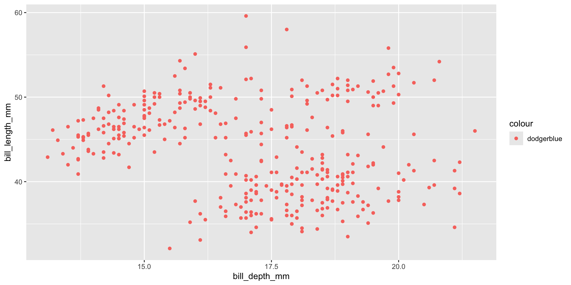 aes, it assumes that it’s a data variable."dodgerblue" gets converted into a variable with one level and it gets colored by ggplot’s default color palette.Don’t put attributes inside aes()!