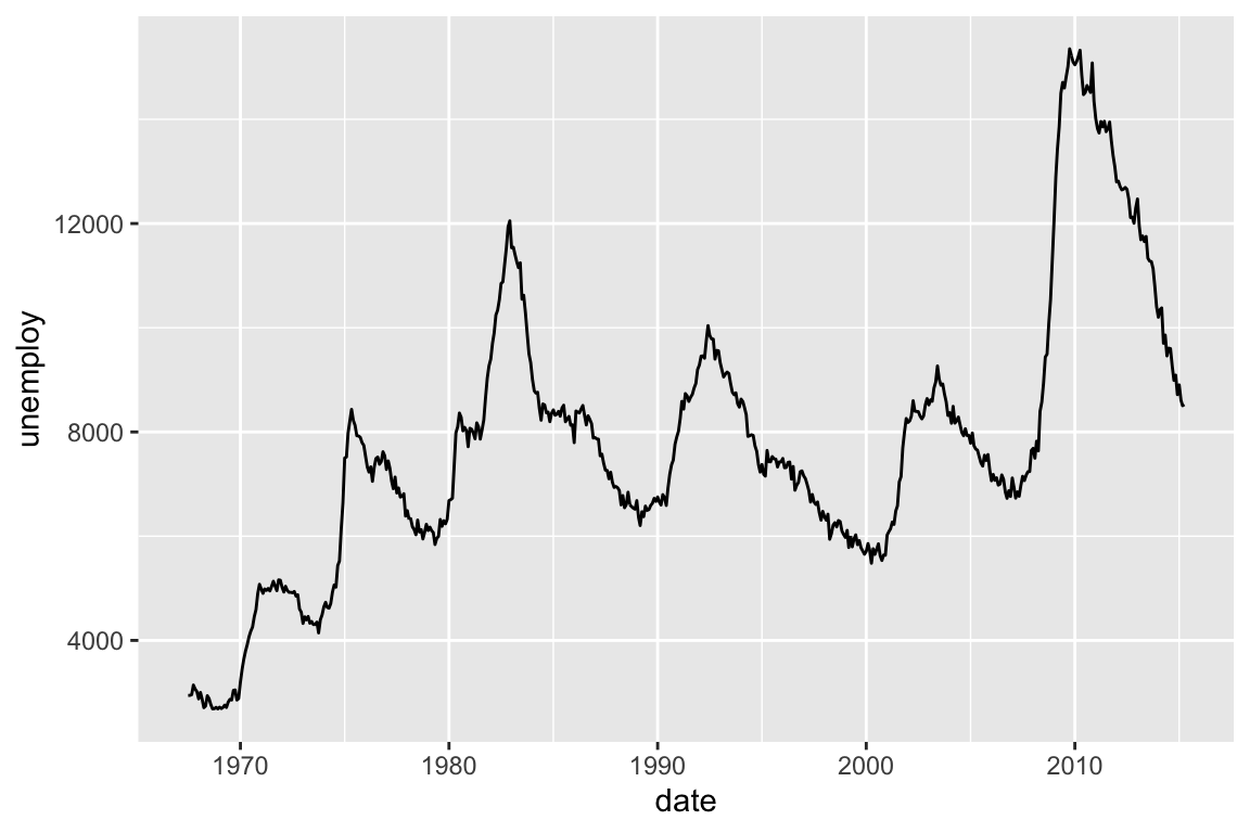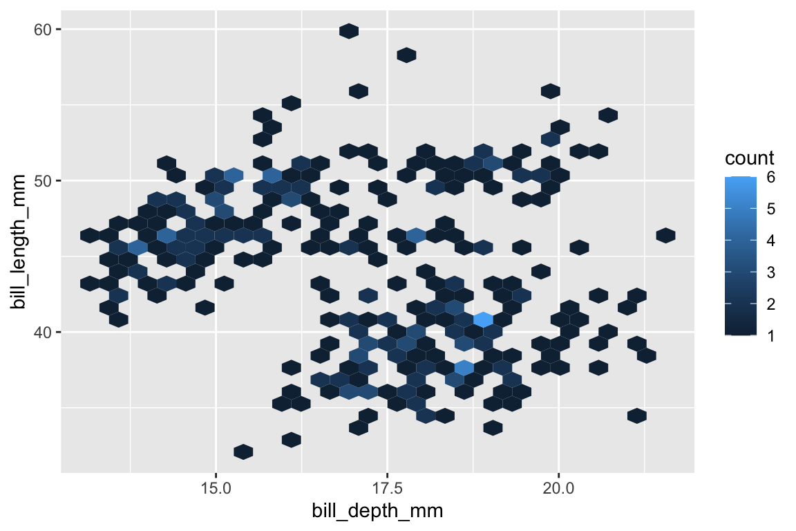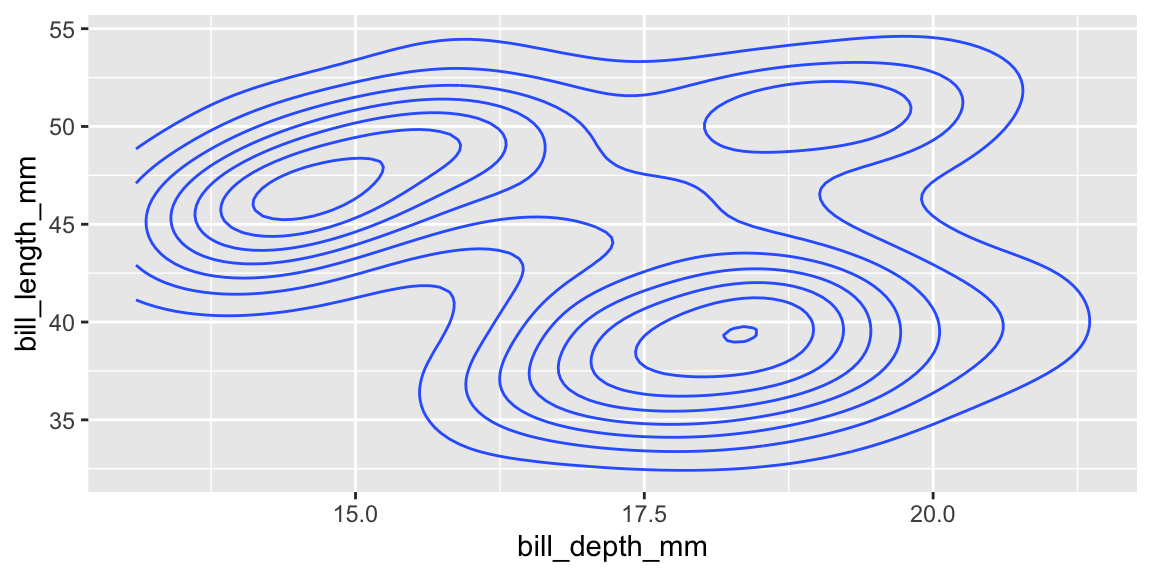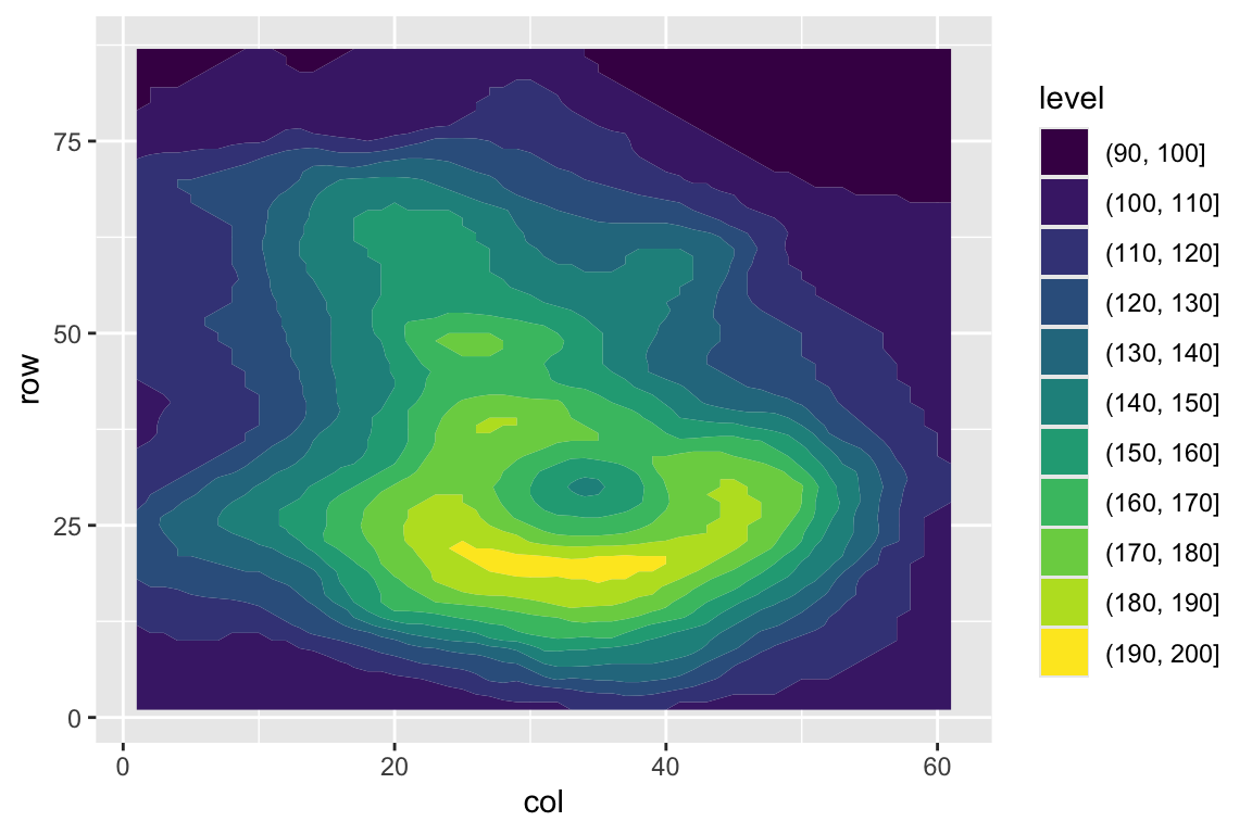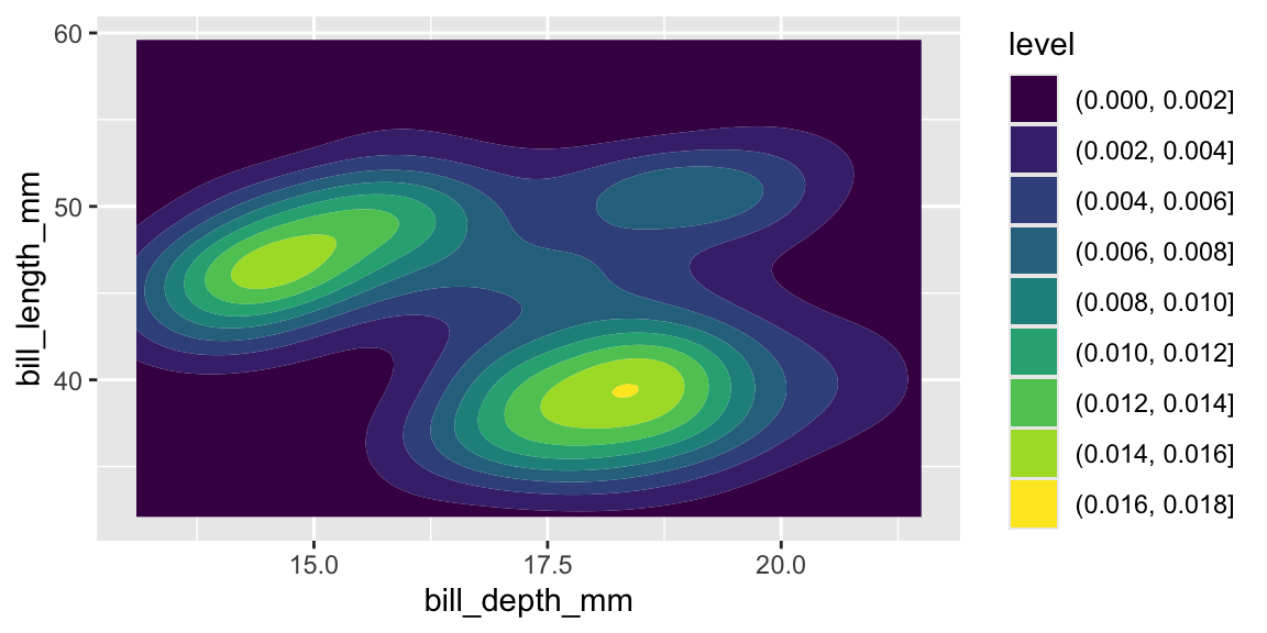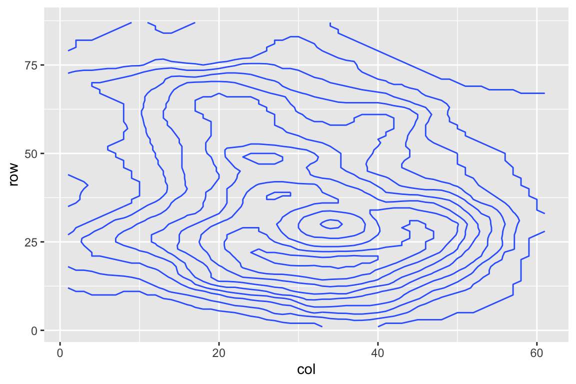 I() operator to mean “as-is” in aesthetic mapping.ggplot() but not attributes like this.geom_hex()geom_bin_2d()geom_bin_2d() is the same as geom_hex() but the shape is a rectangle instead of a hexagon.geom_count()geom_count() counts the number of points in the same locationsize.geom_density_2d()geom_density_2d() is useful.MASS::kde2d().geom_density_2d_filled()geom_density_2d() draws the contour linegeom_density_2d_filled() draws the contour bandsggplot first.volcanod <- data.frame(row = as.vector(row(volcano)),
