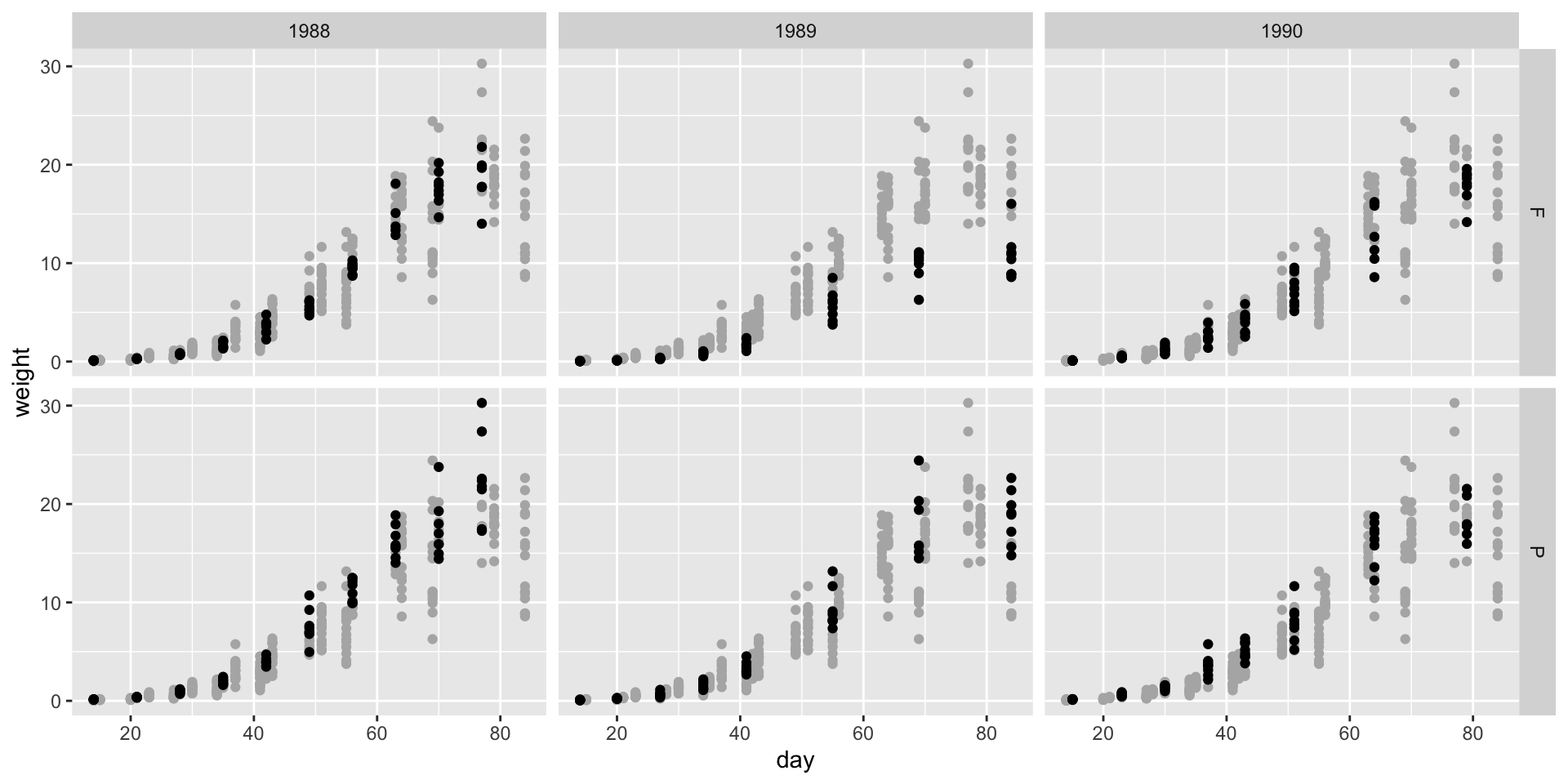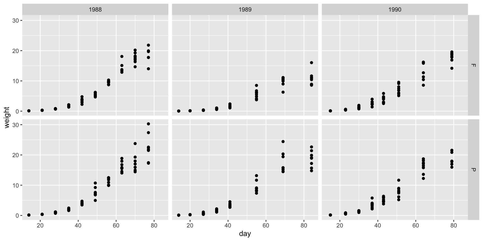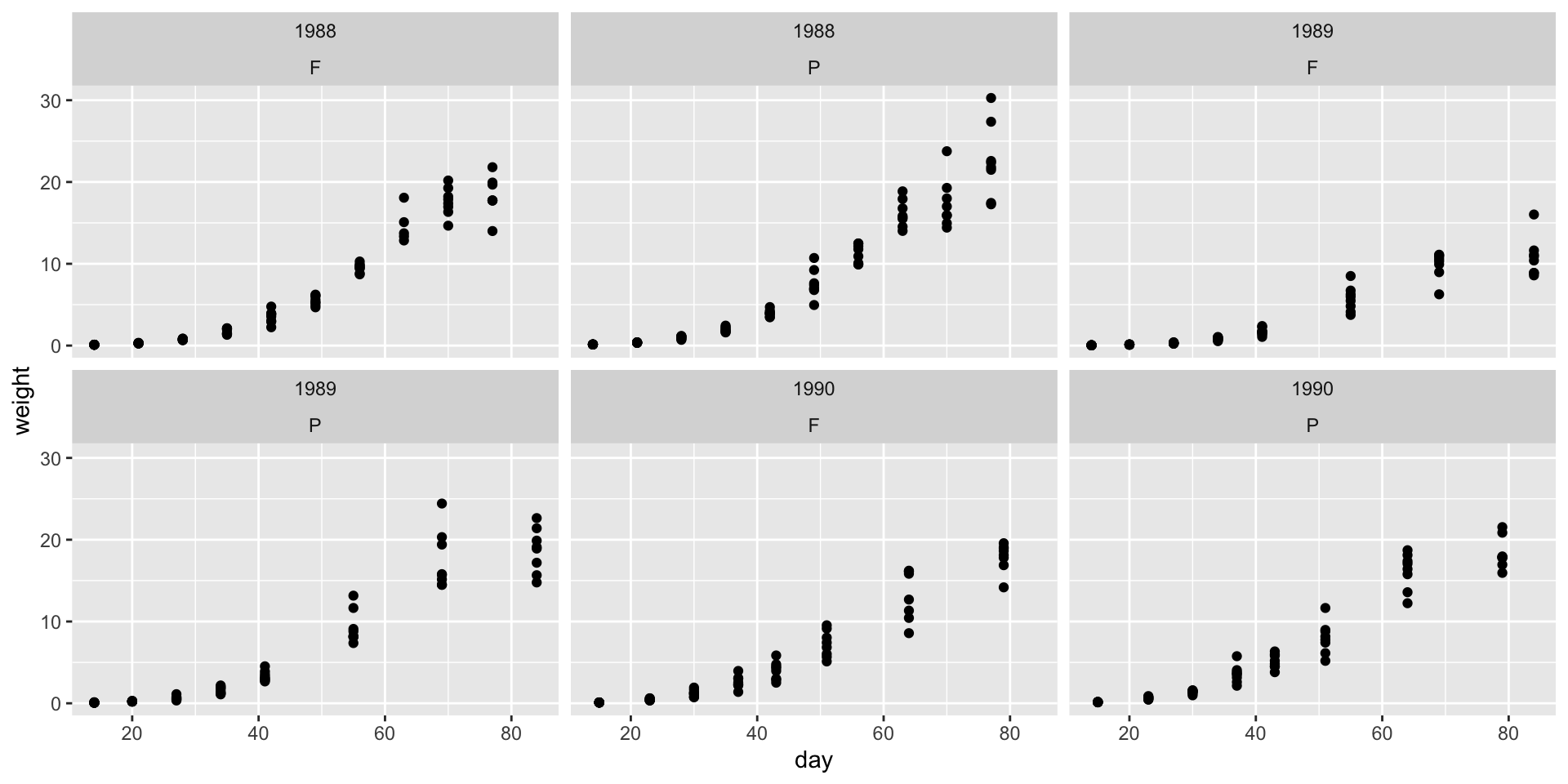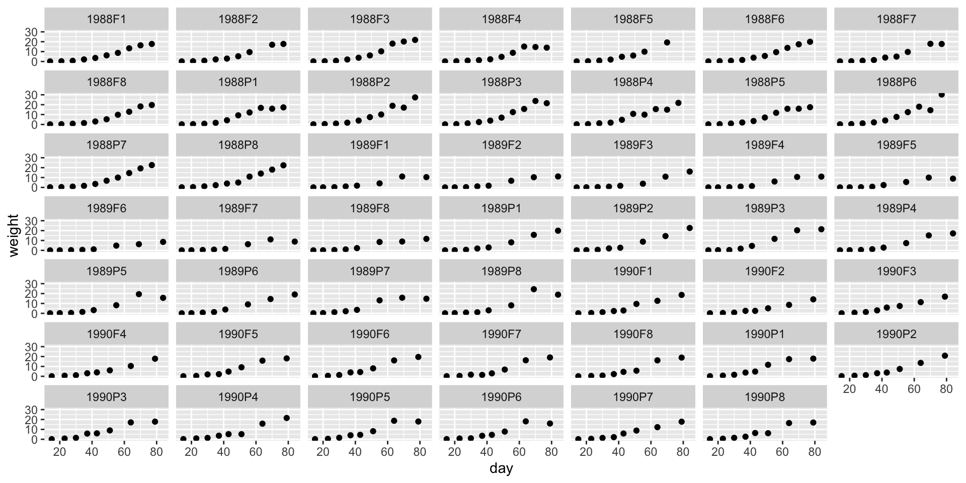 $ day : int 14 21 28 35 42 49 56 63 70 77 ...