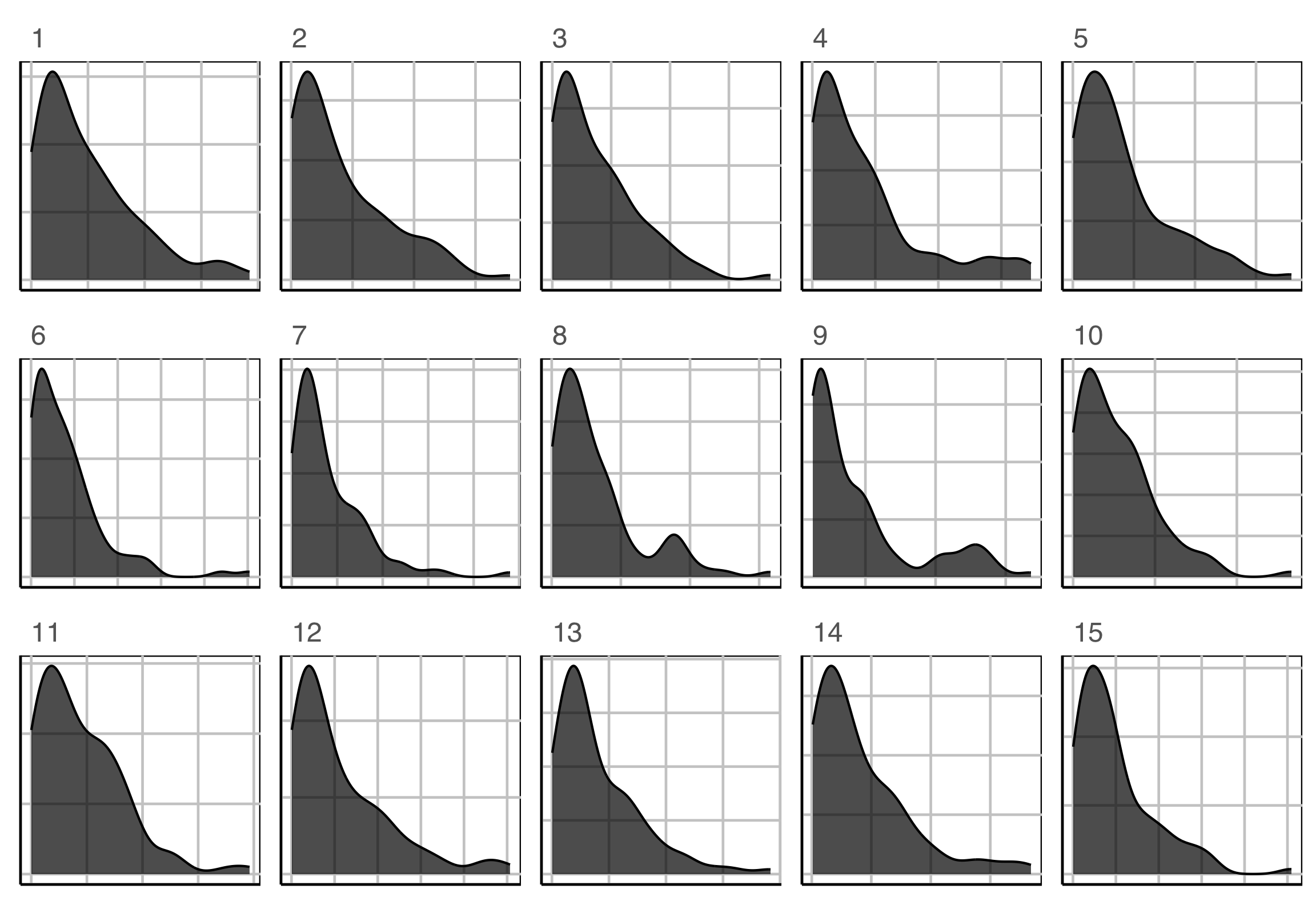create a lineup with a different design, that you think might reveal the data distribution as different from null samples, better than the density plot. Possibilities could include geom_histogram, ggbeeswarm::quasirandom, lvplot::geom_lv.