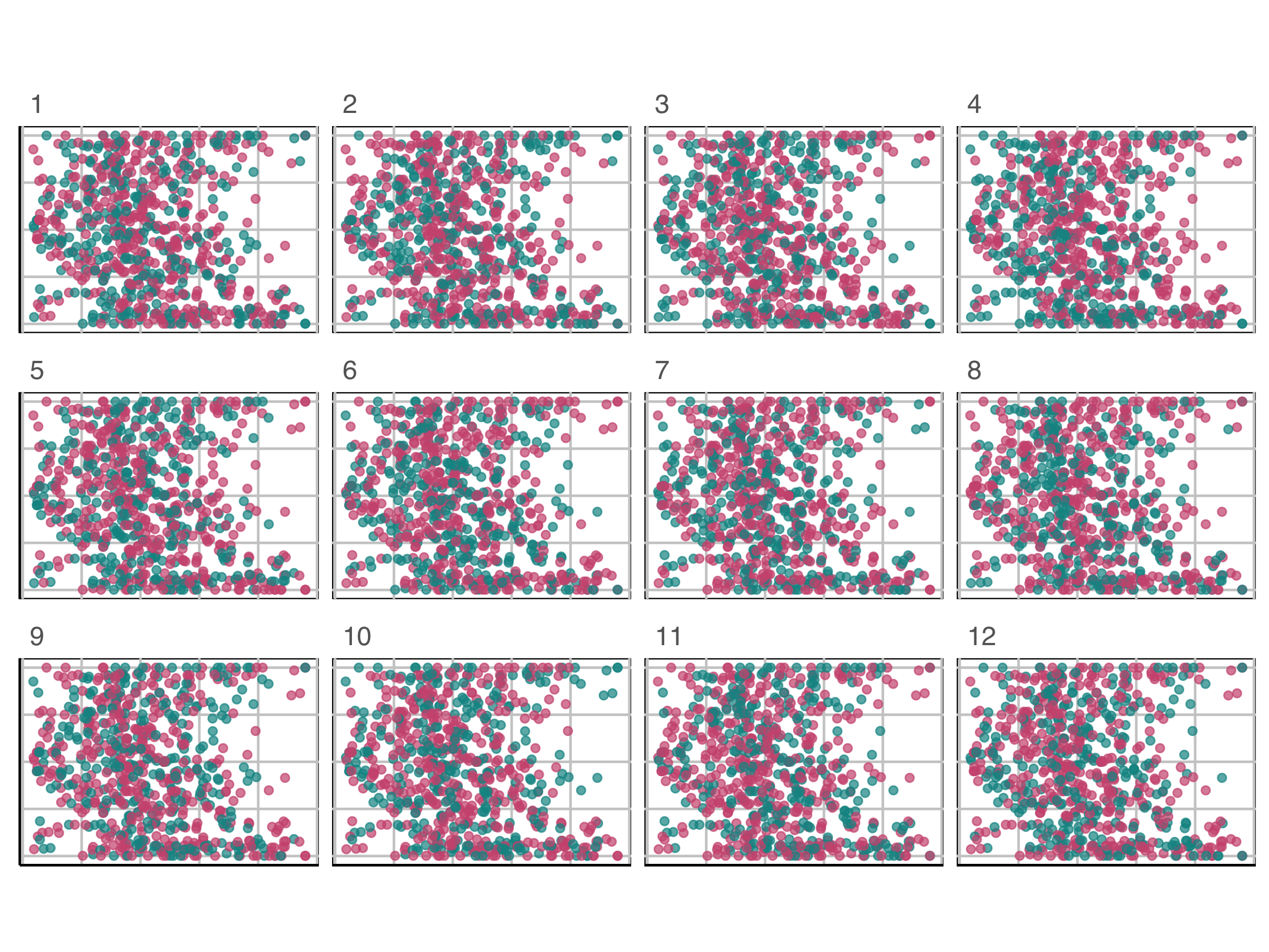If 10 people are shown this lineup and 1 picked the data plot (position 6), which is the data plot, the \(p\)-value will be large.