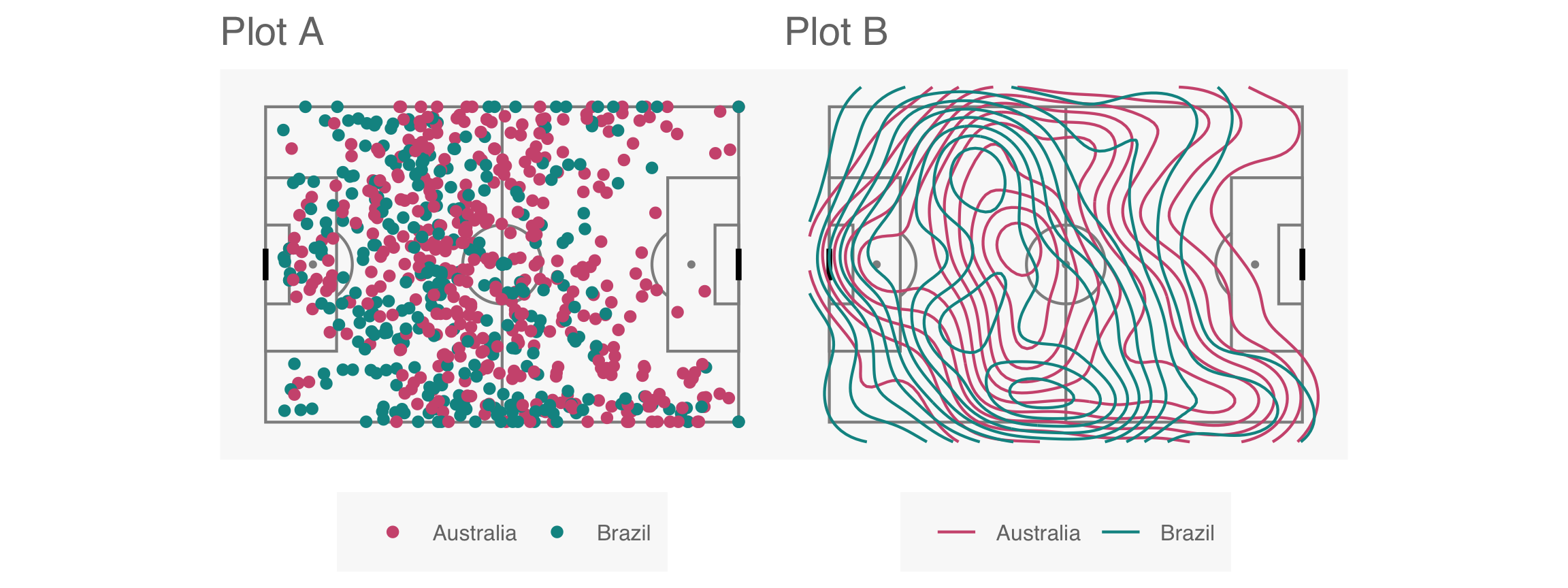 This is the pair of plot designs we are evaluating. Comparing the positions at which passes were made by both teams.